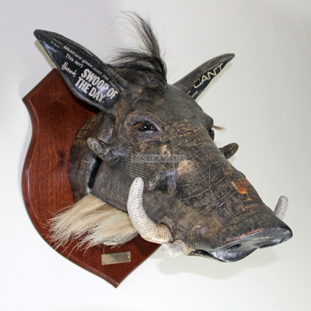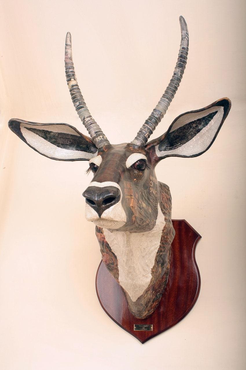 The concept at the heart of Farrer’s work was sparked during his time in South Africa, where encounters with wildlife and contemplation of conservation issues inspired him to rethink traditional hunting trophies. Instead of real animal heads, he began crafting intricately detailed papier-mâché versions from recycled materials – each piece mounted like a classic trophy but reimagined with ecological sensitivity and artistic depth.
