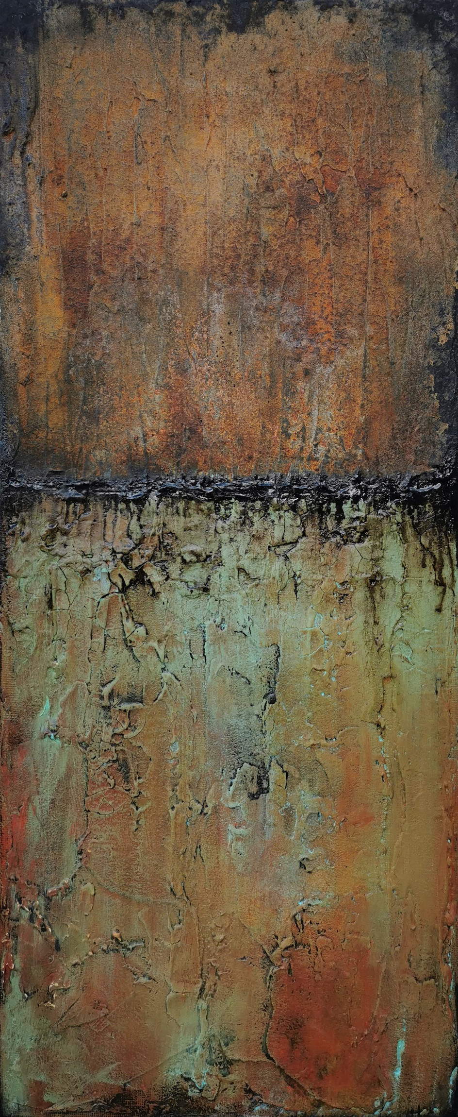 Shelly Cook 49, was born in Reading but with family roots in Cornwall, she finally felt she came ‘home’ 25 years ago. Cornwall’s rugged industrial landscapes, beautiful coastlines and rich mineral heritage have driven her creatively for all these years, however, it was only after a succession of untimely bereavements and changes to her life that she picked up a paintbrush, discovering a positive way to process her grief. She has painted prolifically since, producing a large body of highly personal work connecting her love of the natural world and human emotion, with a focus on texture and the transformations of age and decay.